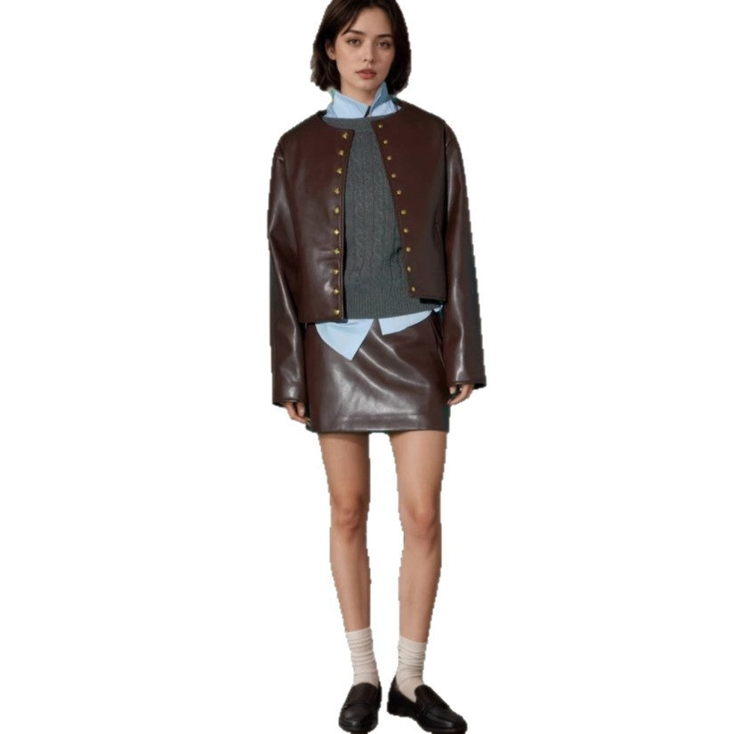 Gold Button Fashion Short Leather Coat